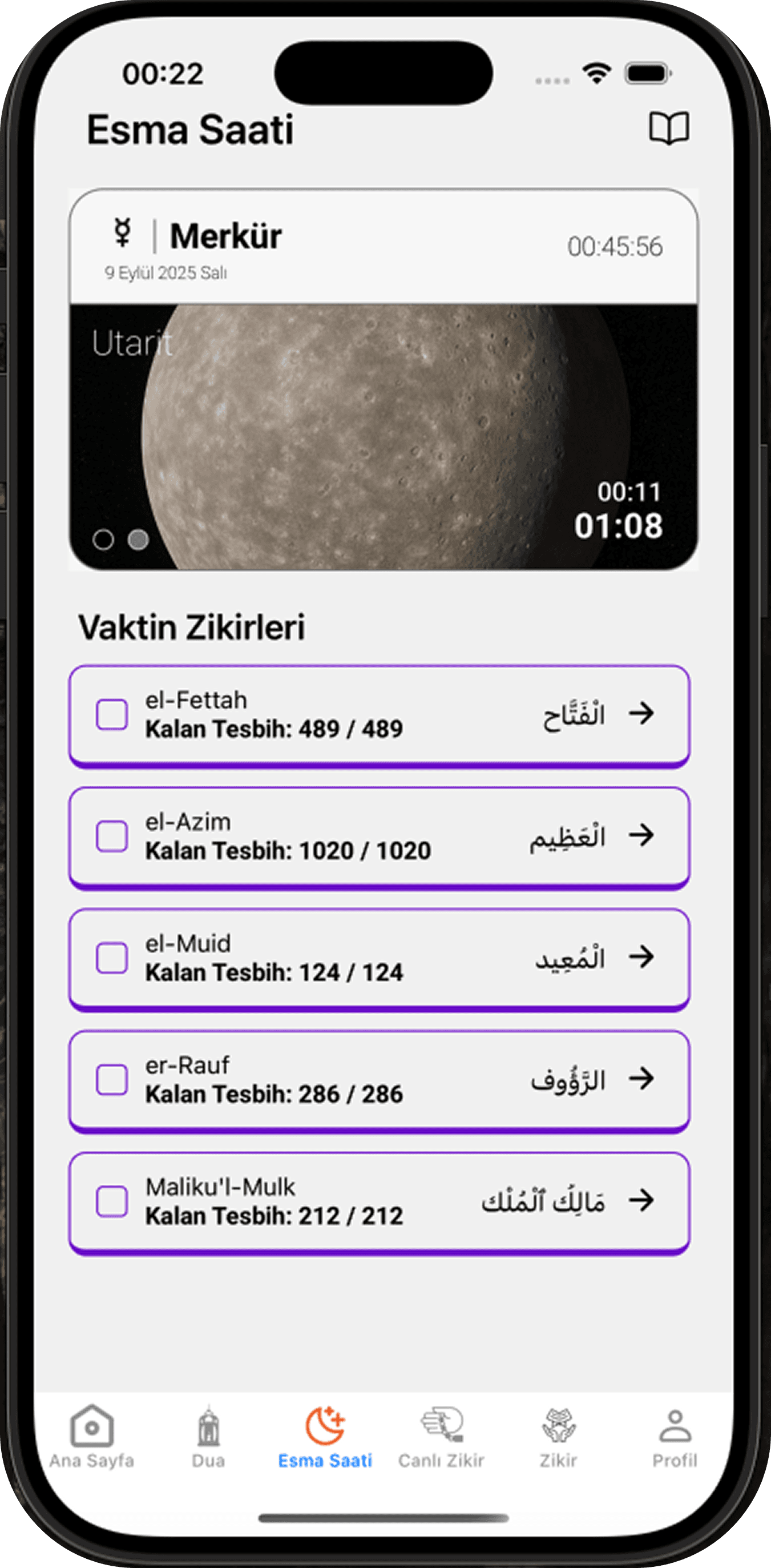 Namaz vakitleri, esma saatleri, temel zikir ve hadis kütüphanesi.
